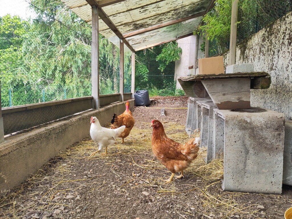 C’est du temps et du travail ! Nous y allons deux fois par jours pour vérifier que tout se passe bien, les nourir, vérifier l’eau, et voir s’il y a des oeufs. Mais les oeufs prendront un peu de temps : elles sont encore un peu jeunes (l’éleveur nous a annoncé plutôt fin du mois), et elles ont besoin de se sentir bien et en sécurité avant de pondre. Nous verrons bien !