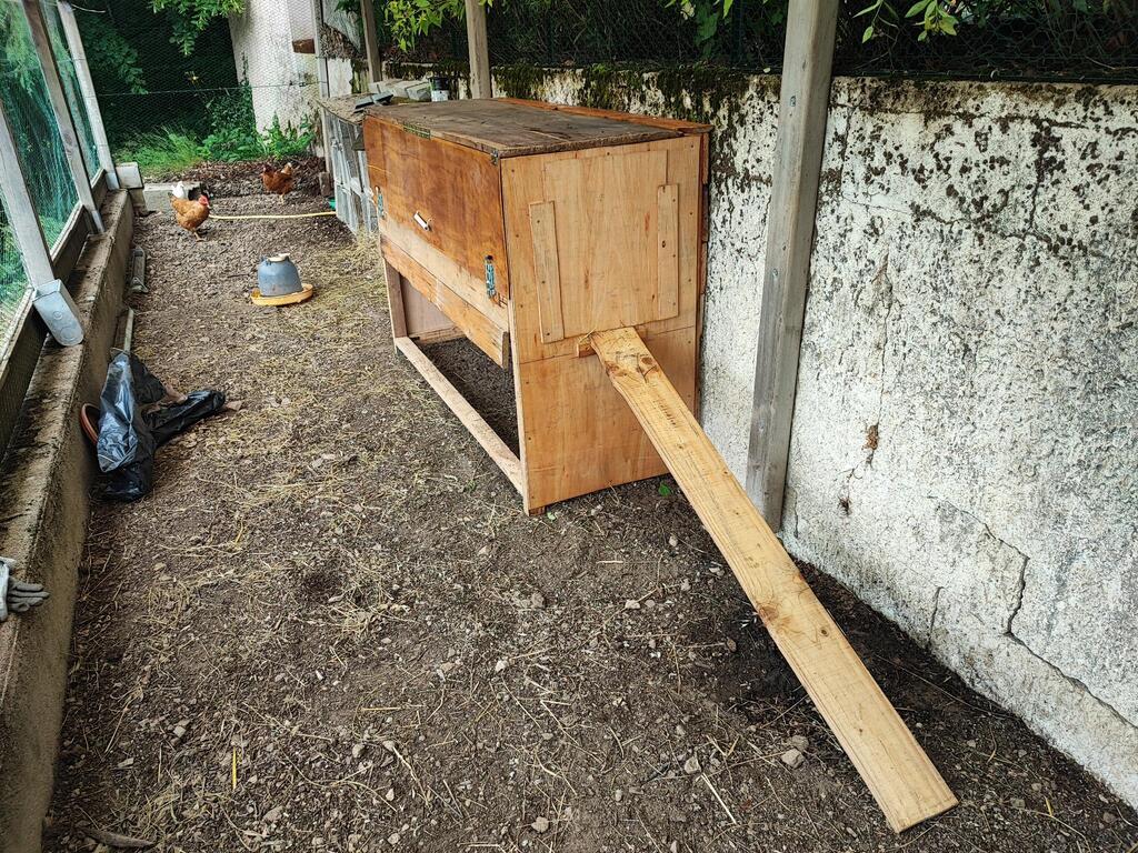 Le poulailler d’origine était déjà très bien fait, et solide – c’est nécessaire car nous sommes en bordure de forêt, et les renards et autres fouines ne manquent pas. Nous y avons ajouté un abri en dur pour qu’elles puissent passer la nuit à l’abri et se sentir en sécurité. Quand elles se sentiront suffisamment chez elles, nous pourrons les laisser sortir dans le jardin en journée.